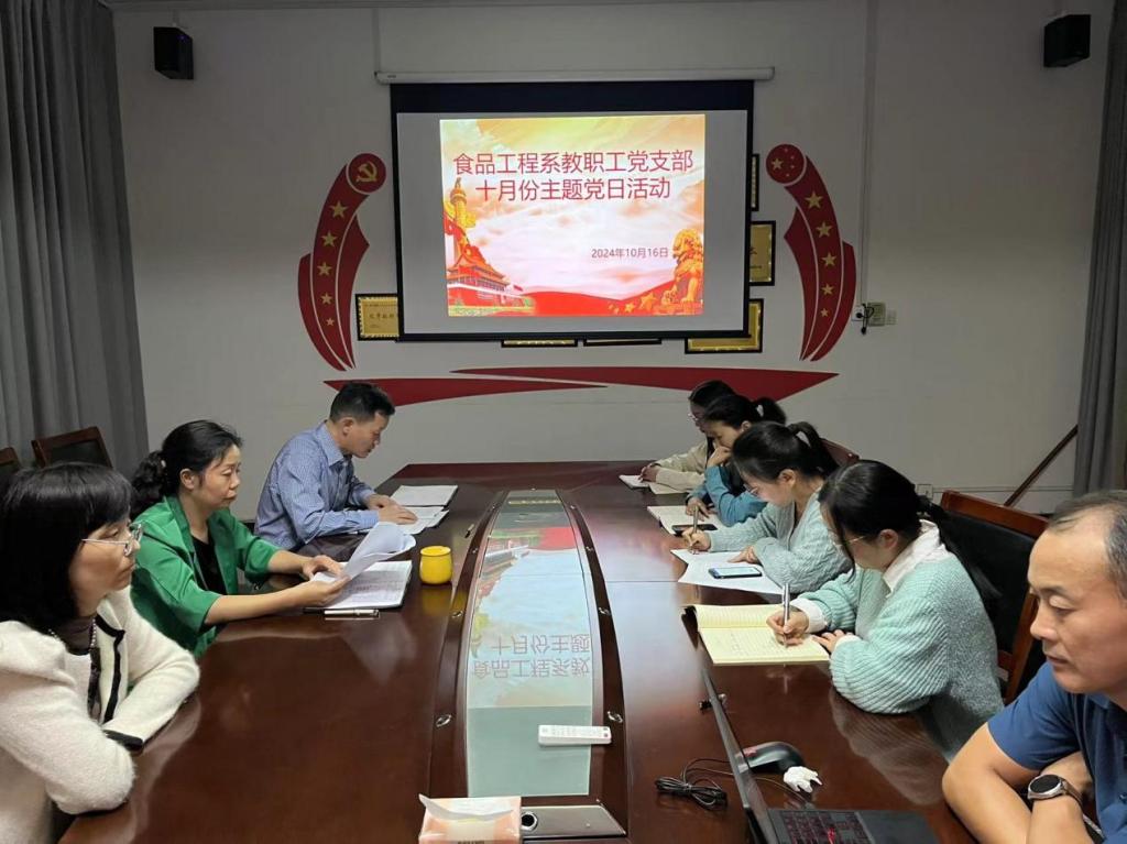 10月16日,食品工程系教工党支部在系党员活动室召开10月份主题党日活动。本次活动由食品工程系教职工党总支负责人王新娜主持,全体党员参加活动。