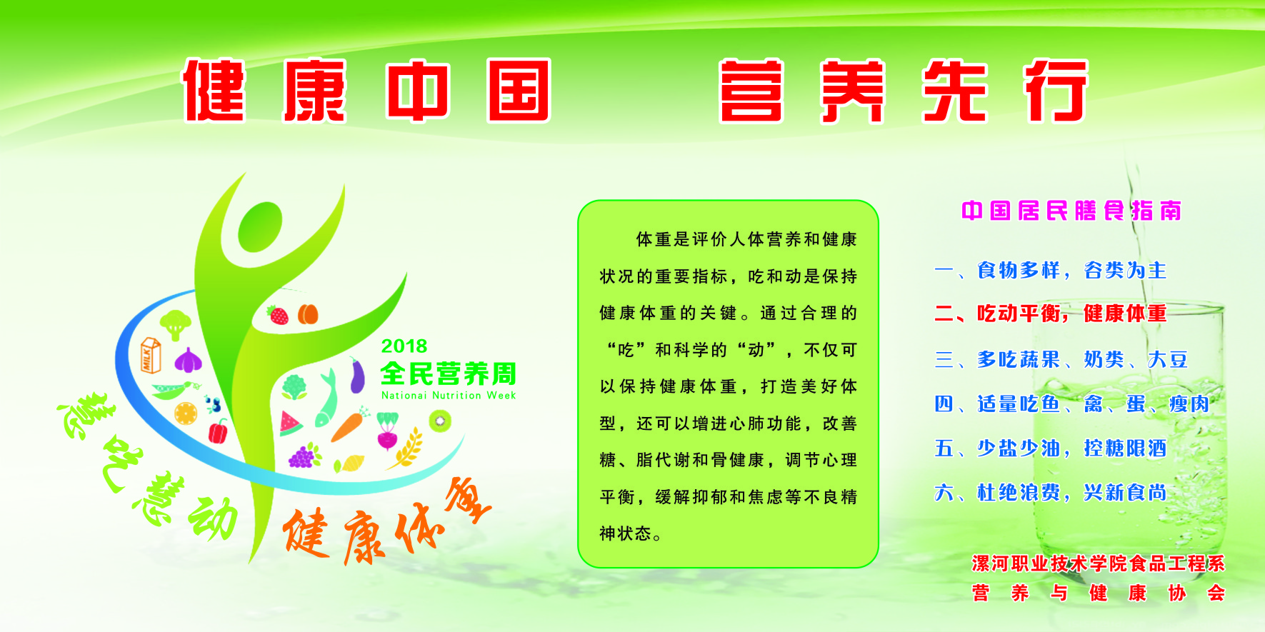 在利来w66食品工程系领导大力支持下,本次营养周活动由食品营养与检测教研室和营养与健康协会承办,系员工会积极协办。在营养周期间食品营养与检测专业的老师和全系热爱营养知识的同学们走进校园、公司家属院、社区等场所,对 “吃动平衡,健康体重”的健康理念开展宣传与咨询活动,向广大同学和居民宣传健康体重的重要性,讲解怎样合理膳食、开展积极有益的运动、保持健康体重。同时还对群众提供健康体重的评估服务和相关咨询服务,解答人们关心的营养与健康问题。