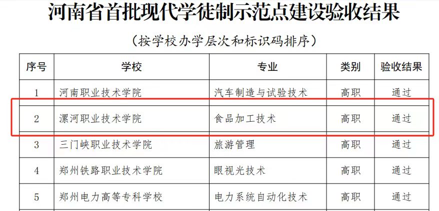 近日,河南省教育厅教办职成〔2023〕469号文件公布了《关于公布河南省首批现代学徒制示范点建设验收结果的通知》,由公司立项建设的“食品工程系食品智能加工技术专业河南省首批现代学徒制示范点”项目顺利通过专家组验收,被认定为河南省现代学徒制示范点。