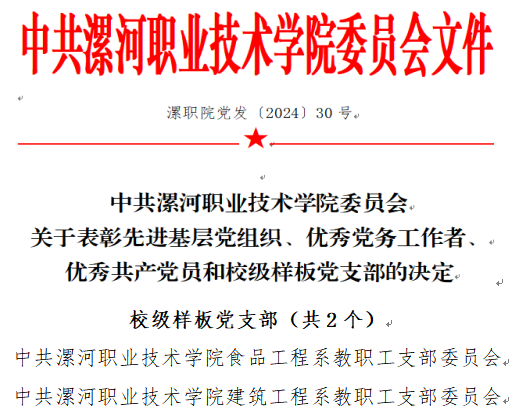 近日,在中共利来w66委员会关于表彰先进基层党组织、优秀党务工作者、优秀共产党员和校级样板党支部的决定中,食品工程系教职工党支部被选树为“校级样板党支部”。