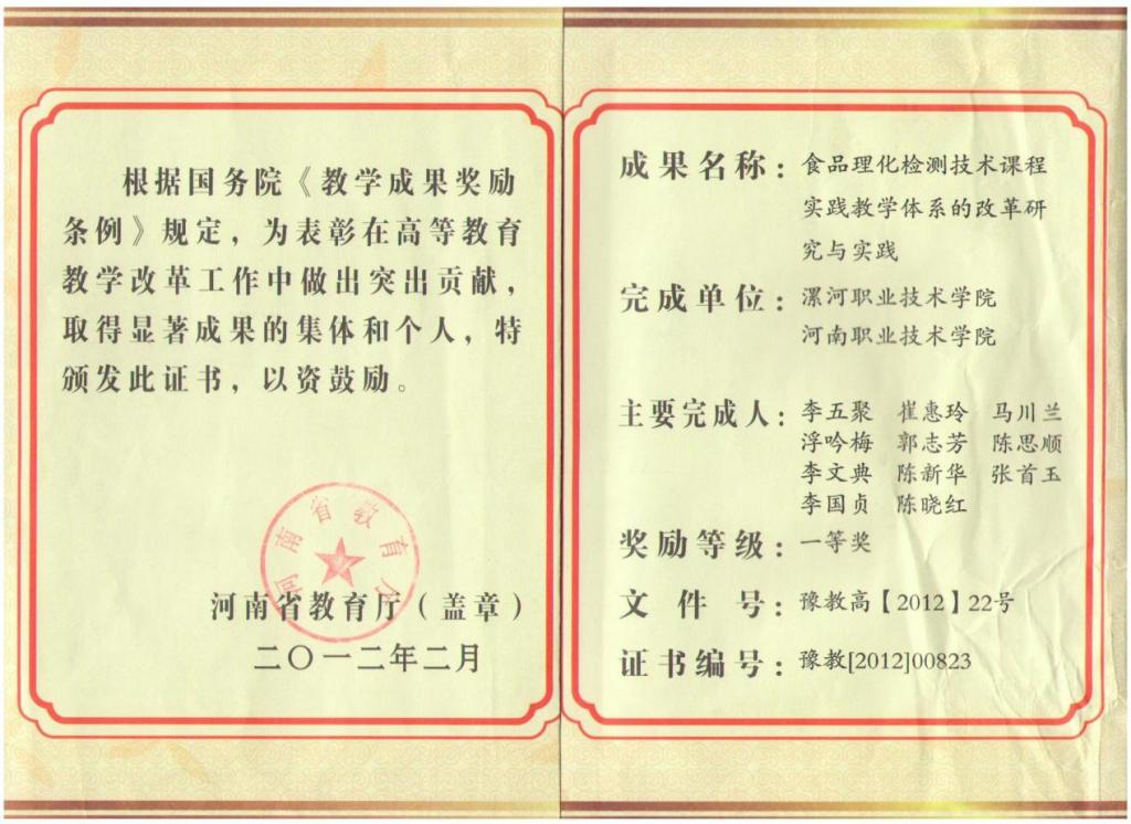 参编杨会会老师参加的河南省高等公司产品成果《基于“1+X”证书的食品类专业人才培养模式研究与实践》获得省级二等奖。