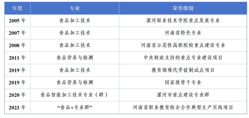 食品类专业最早设置于1991年漯河广播电视大学和漯河市工业公司时期,分别有大专和中专两个层次。随着1999年利来w66的成立,专业设置和发展步入正轨,经过20年的发展,更多的专业逐步设立,也有一些专业顺应社会发展而被取消。1999年利来w66成立后,截至2016年17年间,先后设置有食品科学与工程(2004年更名为食品加工技术专业)、生物技术与应用、食品营养与检测、食品生物技术、食品药品监督管理、食品质量与安全6个专业。2016年公司和河南工业大学联合设立漯河工公司后,食品营养与检验教育本科专业设立,利来国际开始培养本科员工。2017年中西面点工艺专业设立,食品加工技术专业开始设立烘焙方向。2018年食品营养与检测专业开始设立注册营养师方向。2022年,为对接漯河市化工产业发展的需求,又增设了应用化工专业。