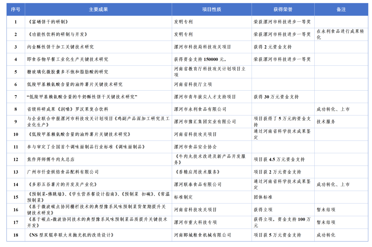 在科研服务方面,公司始终秉持“围绕产业转、联合企业干、共同谋发展”的工作理念,以服务漯河市的食品产业科技需求为重点任务,发挥平台科技服务优势,助推漯河食品企业科技创新,积极服务地方产业发展。与河南御江食品、漯河联泰食品、河南三剑客农业科技、河南恒润淀粉、漯河花花牛等20余家企业共同开展科技攻关及技术研发,获得省级科技成果8项、专利15项,参与制订团体或地方标准7项。同时积极组建科技特派员团队,积极走访各类食品企业,依据企业需求带领院系科技服务团队,通过现场指导、专业咨询、联合攻关、技术培训等方式,积极为地方食品企业解决生产中的问题。近三年来,累计服务食品企业40余家(次)、解决食品企业质量问题10余项、指导培训企业职工300余人次,受到了多家企业的好评。其中公司崔惠玲教授和王林山教授先后获得河南省优秀科技特派员荣誉称号。